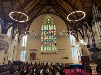 New LED lighting was installed to highlight the church’s architecture and provide consistent illumination for services and events.